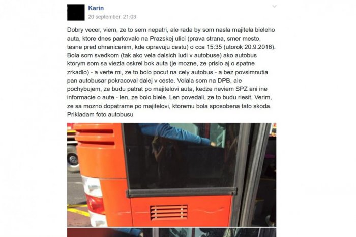 Pred pár dňami sa zase objavili fotky autobusu bratislavskej MHD, ktorý bokom vrazil do zaparkovaného auta a bez povšimnutia išiel ďalej. Cestujúca týmto autobusom časť vozidla odfotila a fotky zavesila na sociálnu sieť s textom:
