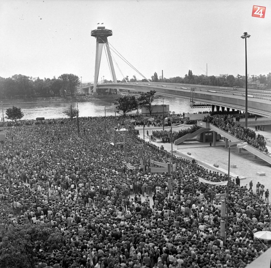 Na archívnej snímke z 26. augusta 1972 v Bratislave manifestácia na počesť 28. výročia SNP, spojená s odovzdaním Nového mosta cez Dunaj.