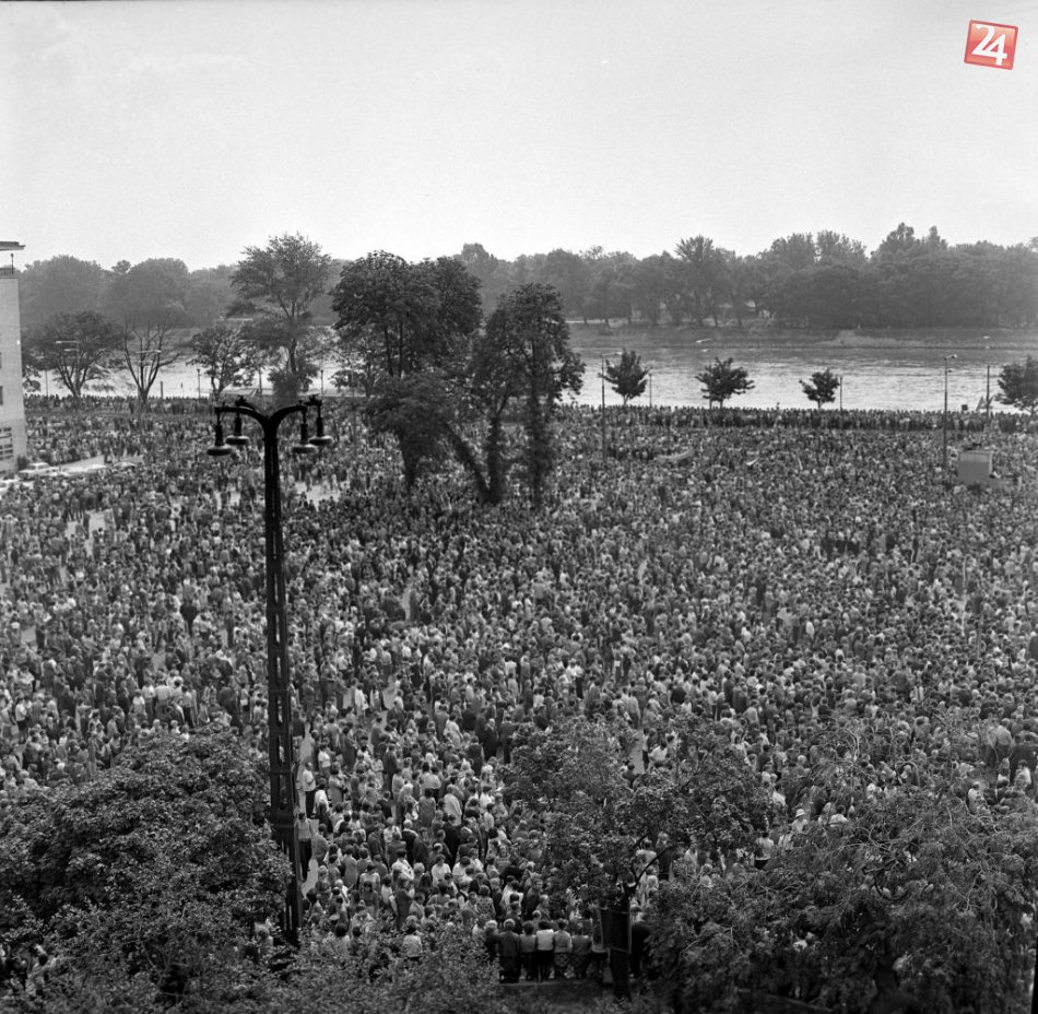 Na archívnej snímke z 26. augusta 1972 v Bratislave manifestácia na počesť 28. výročia SNP, spojená s odovzdaním Nového mosta cez Dunaj.
