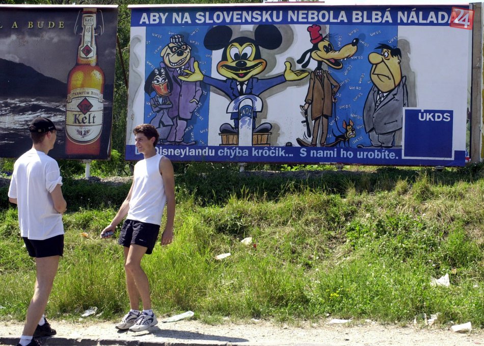 Volby 2002 - Do Disneylandu chýba iba krôčik... S nami ho urobíte" nalepil neznámy objednávateľ na reklamnú plochu agentúry Europlakat neďaleko študentských internátov v Mlynskej Doline v Bratislave.