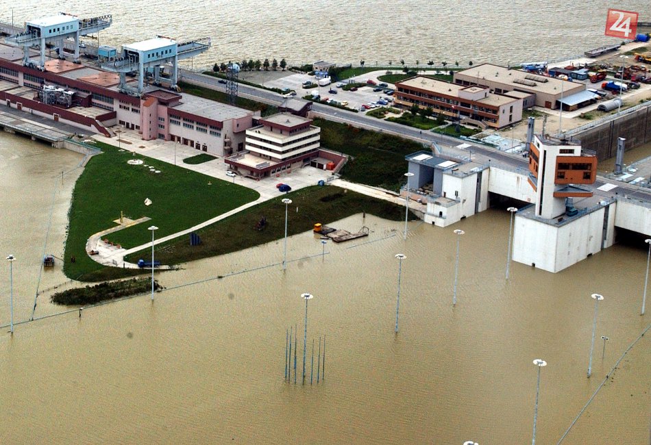 Povodeň na Dunaji: Letecký pohľad na zaplavenú časť obslužných komunikácií na hrádzi Vodného diela Gabčíkovo v auguste 2002.