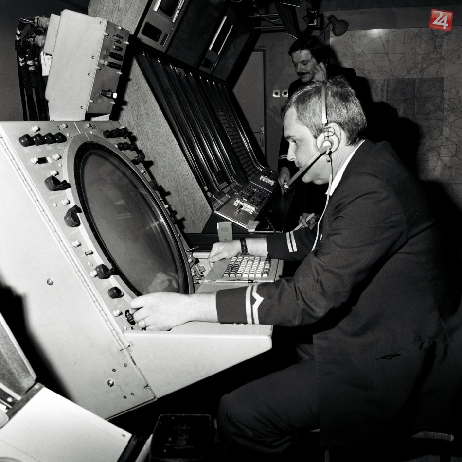 Riadiaci letov Peter Kunštek sleduje radarovú obrazovku na bratislavskom letisku 26. novembra 1980. Autor: P. Šimončík.