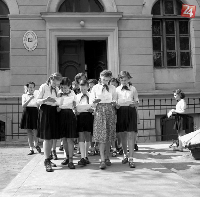 Na archívnej snímke z 18. júna 1955 koniec školského roka v areáli osemročnej strednej školy s vyučovacím jazykom maďarským v Bratislave.