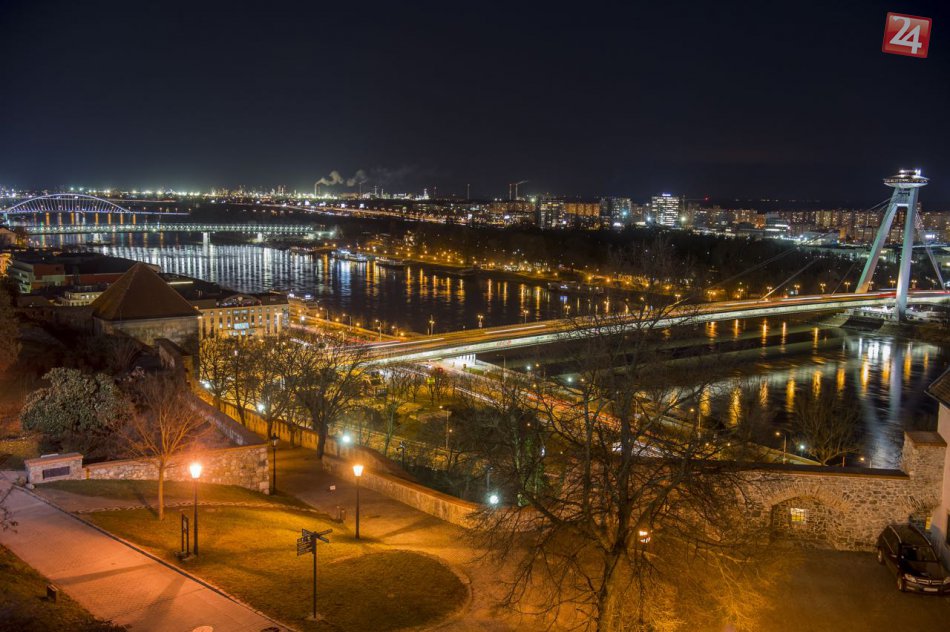 Večerný pohľad na bratislavské mosty. Vpredu most SNP, osvetlená nová mostná konštrukcia Starého mosta, most Apollo a celkom vzadu Prístavný most. Foto - Michal Svítok.