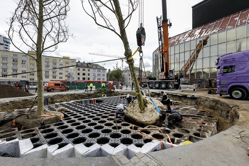 Galéria k článku FOTO: Trnavské mýto už nebude ako predtým. Z hodiny na hodinu na ňom vyrástli obrovské platany +VIDEO
