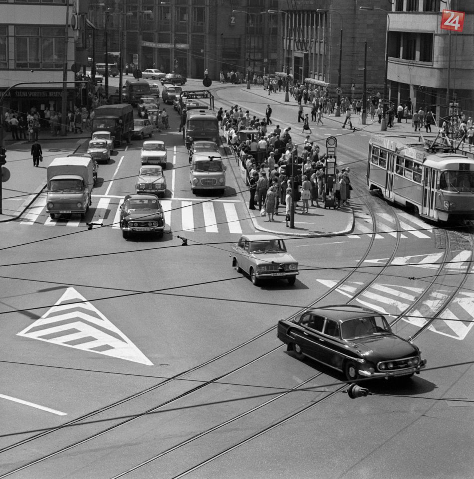 Na archívnej snímke z 22. júla 1973 dopravný ruch na Námestí SNP v Bratislave. FOTO TASR - Jozef Teslík.