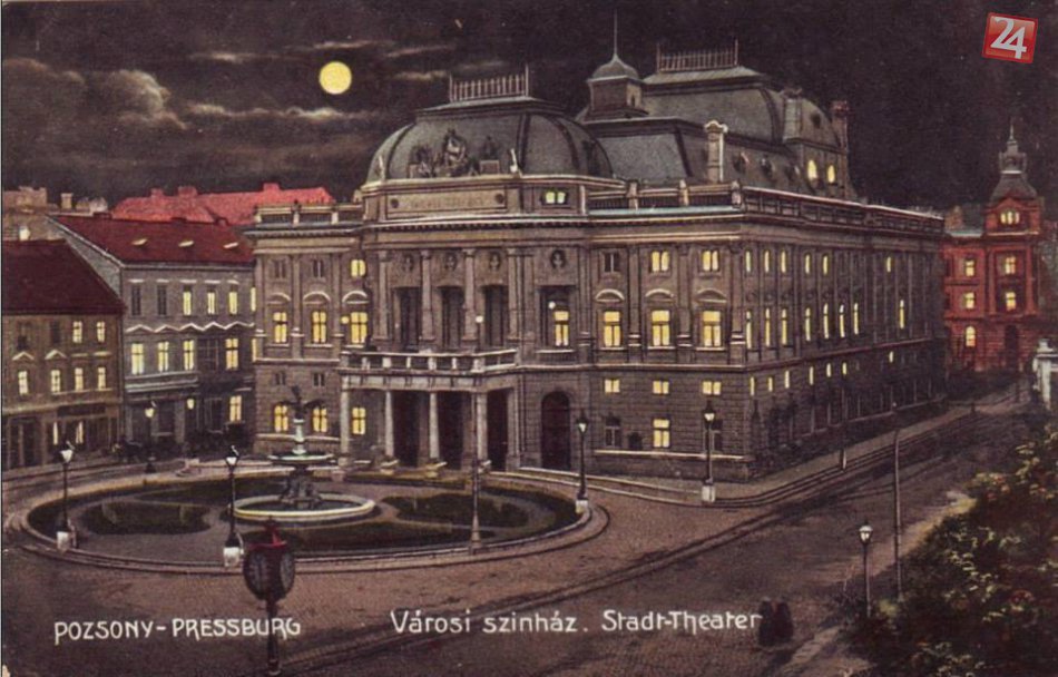 Dobová forografia SND v noci, Zdroj foto: Stará Bratislava na fotografiách a obrazoch