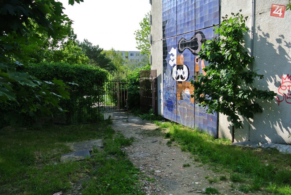 Zabudnutá keramická mozaika „Kocúr“ na budove ZŠ.