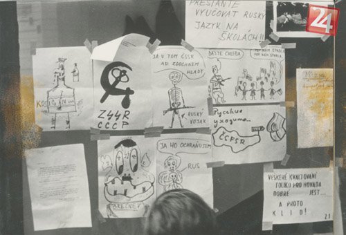 Plagáty vo výklade ironizujúce komunistický režim v ZSSR, výzva zastaviť výučbu ruštiny na školách a ich detský čitateľ.