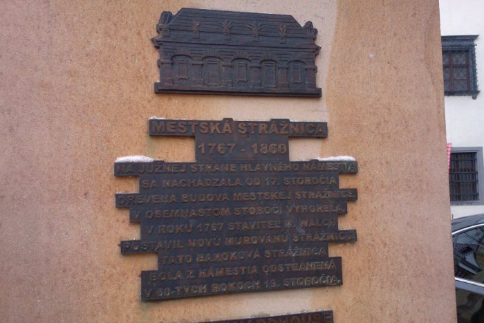 Na Hlavnom námestí sa v 17. storočí nachádzala drevená strážnica, ktorá slúžila najmä na to, aby udržiavala poriadok medzi trhovníkmi. Strážnica v roku 1967 vyhorela. Ešte v tom istom roku staviteľ M. Walch postavil murovanú strážnicu. Stála v južnej polovici námestia, kolmo na budovu radnice. Hlavnou fasádou bola obrátená k palácu miestodržiteľskej rady. Prízemná budova bola dlhá asi 15 metrov, široká asi 8 metrov. Svoju úlohu plnila až do odstránenia v 60. rokoch 19.storočia.
