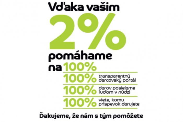 Darcovský portál ĽudiaĽuďom.sk funguje bez akýchkoľvek poplatkov aj vďaka príspevkom z 2% z daní. Na rozdiel od iných platforiem portál posiela príjemcom, hlavne ľuďom v núdzi celú sumu, teda 100% daru. Aj vy môžete byť spoluautorom jeho krásneho príbehu. Viac informácií o tom, ako svoje dve percentá nenechať štátu, ale poslať na pomoc ľuďom v núdzi nájdete na 2percenta.ludialudom.sk.