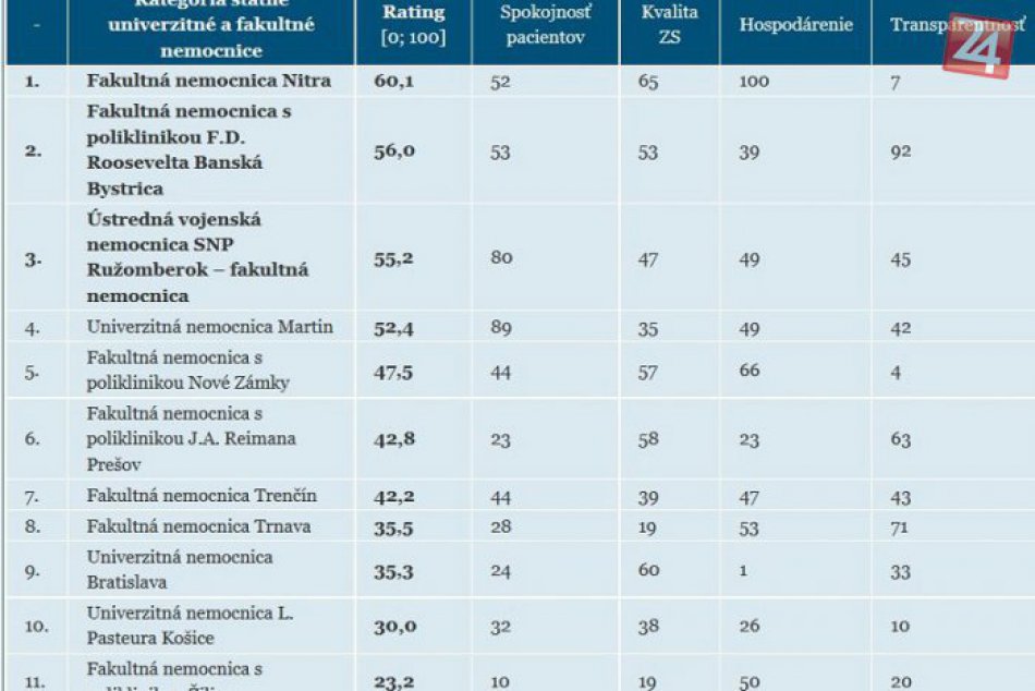 Chcete vedieť, ktorá nemocnica je najlepšia? Hodnotenie nemocníc zverejnil Inštitút pre ekonomické a sociálne reformy (INEKO). Poradie získali podľa vybraných ukazovateľov spokojnosti pacientov, kvality poskytovanej zdravotnej starostlivosti, hospodárenia a transparentnosti za obdobie od roku 2012 do roku 2015.