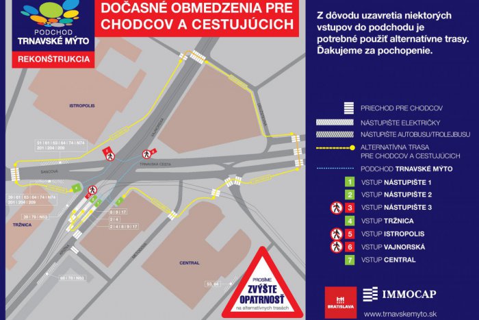 Hlavné mesto v spolupráci s developerskou spoločnosťou Immocap Group a. s. pokračuje v rekonštrukcii podchodu na Trnavskom mýte podľa plánu. V najbližších dňoch sa vydaním rozhodnutia Stavebného úradu sprístupnia verejnosti doteraz uzavreté časti podchodu a naopak, tie doteraz otvorené, sa pre potreby rekonštrukcie dočasne uzatvoria. Ide o poslednú fázu rekonštrukcie a Bratislavčania sa čo nevidieť dočkajú moderného, bezpečného a bezbariérového podchodu.