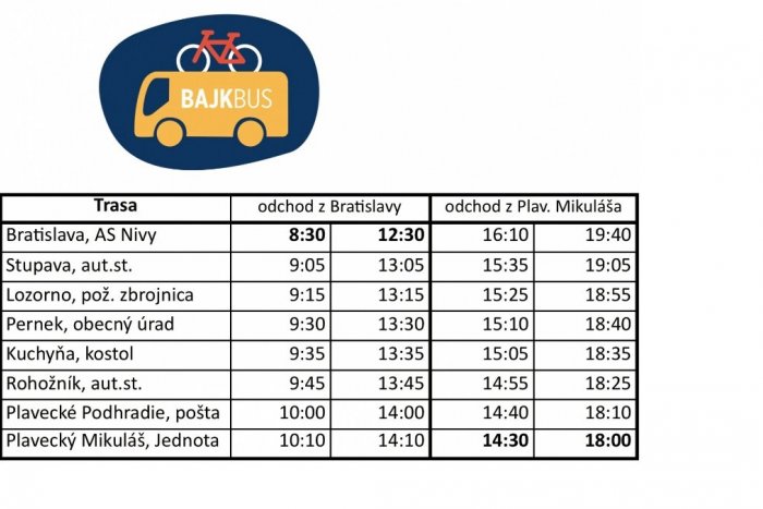 Bajkbus štartuje z bratislavskej stanice Nivy a pokračuje cez Stupavu až do Plaveckého Mikuláša. Jeho súčasťou je príves pre 30 bicyklov.