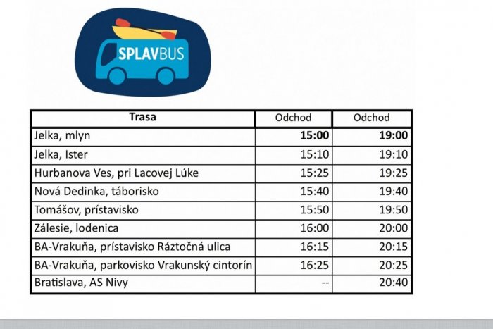 SplavBus je novinkou tohtoročnej sezóny. Každý víkendový deň a cez štátne sviatky „zbiera" vodákov z Jelky do Bratislavy. Ak si objednáte splav Malého Dunaja u niektorej z požičovní, pýtajte sa aj na možnosť ľahšieho návratu zo splavu domov, kde vám môžu rezervovať miesto v SplavBuse.
